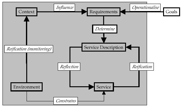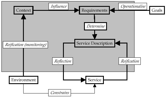 The rest of this section is devoted to a detailed explanation of the framework constituents. This explanation will follow a precise path that moves from the outside inward i. e., from the outer world towards the boundaries with the machine, and finally inside the machine itself. Therefore, we will start from what is available in the world: goals and environment. We will operationalise goals into requirements, and represent environment information into a context; all of this still belongs in the world. Later we will move from requirements and context towards a service description, which is the bridge between the world and the ma-chine (what Michael Jackson calls "specification"). Eventually we move inside the machine with the notion of a service. Note that throughout the paper we will stick to the notion of the machine as pure software; in other words, we will consider devices (PDAs, mobile phones, etc.) as part of the world.