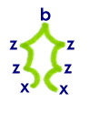 | Usando finalmente a segunda transicão de b para parar o processo de crescimento; a partir de agora, como podemos observar pela tabela de transições, os elementos vão ser substituídos apenas por eles próprios, tornando a estrutura constante daí por diante. | ![]() |