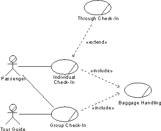 Actors and use cases and the check-in counter. Here we also show the inclusion use case Baggage Handling and the extension use case Through Check-In.